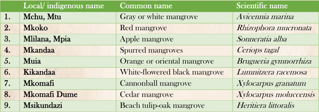 Types of Mangroves found in Lamu, stating the Indigenous, common and scientific names